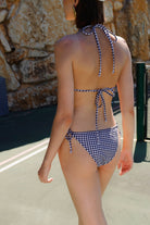 Classic with a golden twist. This black gingham swimsuit is elevated by intricate gold crochet.